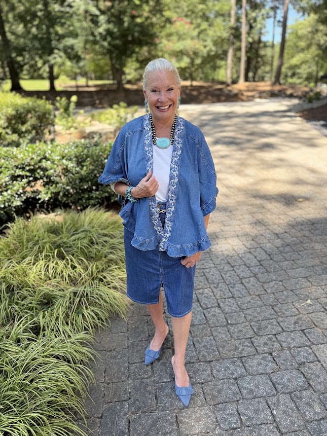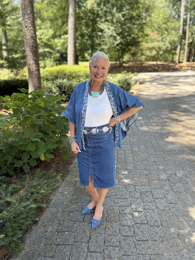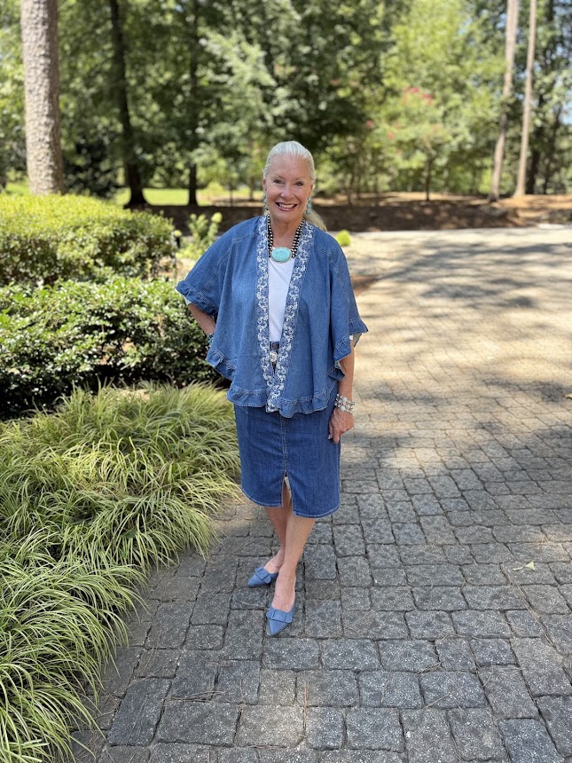 Denim is the heart of Western style. Opt for dark-wash bootcut or straight-leg jeans—they elongate the legs and pair perfectly with boots. A denim jacket is another versatile must-have, great for layering over dresses or tees. I am wearing the Embroidered Denim Ruffled Ruana over the Touch of Cool™ Layering Tee with High-Rise Straight Stretch-Denim Skirt. My jewelry is currently out of stock, but I have some alternative options linked below. My Vianna Muled Kitten heels are on repeat.
