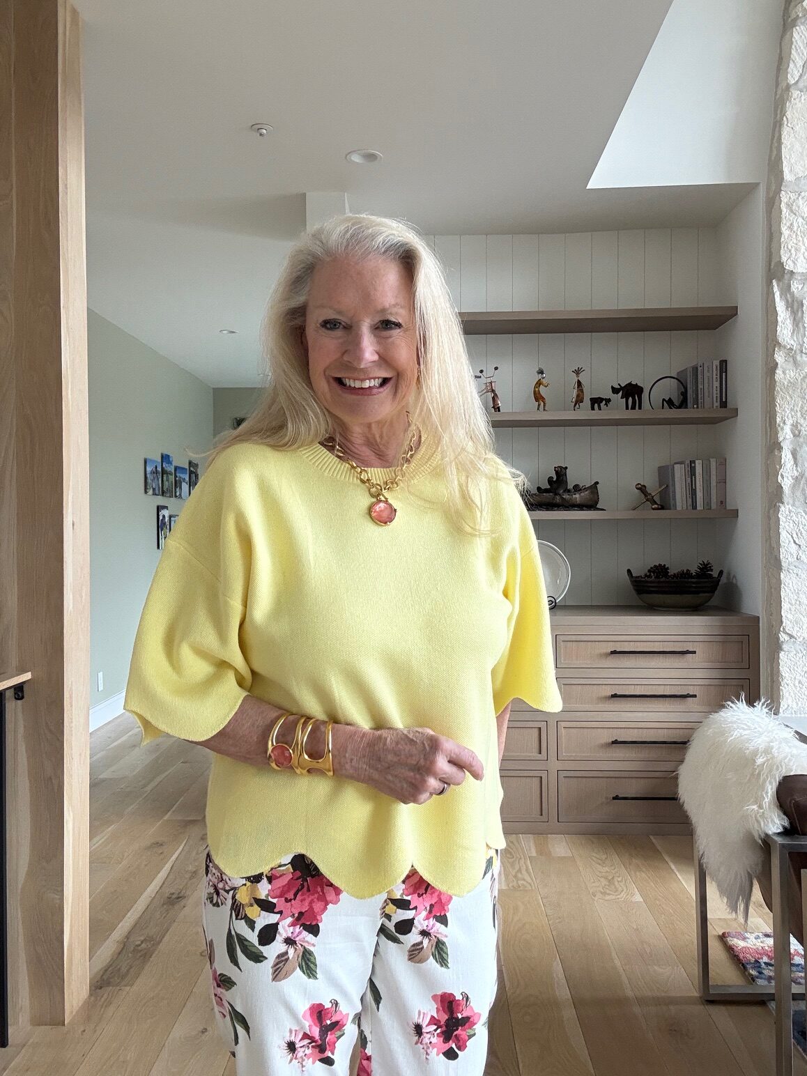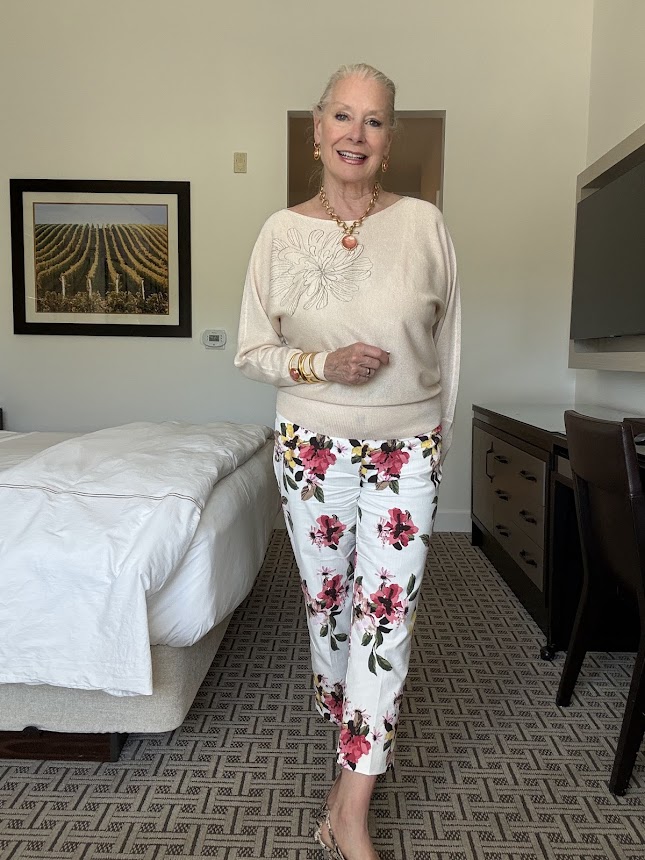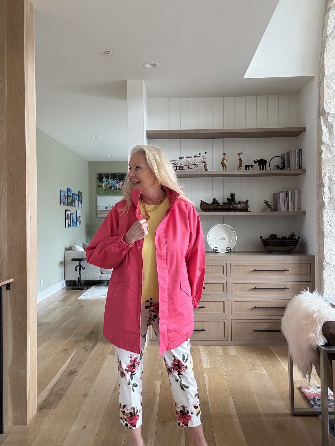 lightweight rain jacket layered over floral, cropped pants and a yellow, scalloped-edged sweater was perfect for the flight and the drive into Napa. I paired it with comfortable pink flats for an easy, pulled-together look.