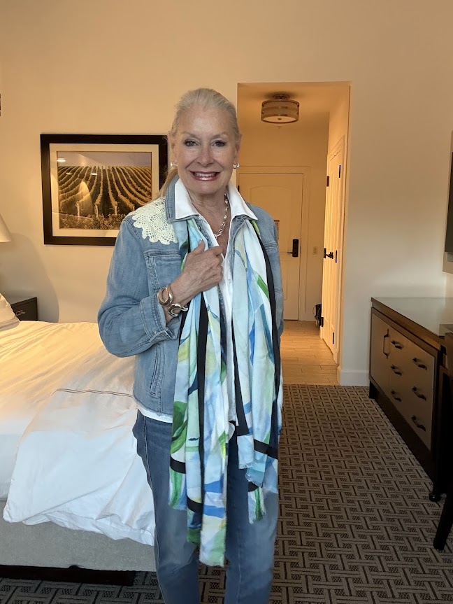 I opted for a relaxed look—Chico’s Embroidered Frayed Denim Trucker Jacket over the Poplin Tie-Front Top, with a Blooming Brush Oblong Scarf and the Skinny Ankle Jeans. My silver turquise jewelry is also from Julie Vos. I’m wearing the Hydra Silver Triple Hoop, the Solara Silver Cuff, and the  Honeybee Silver Statement Necklace.
