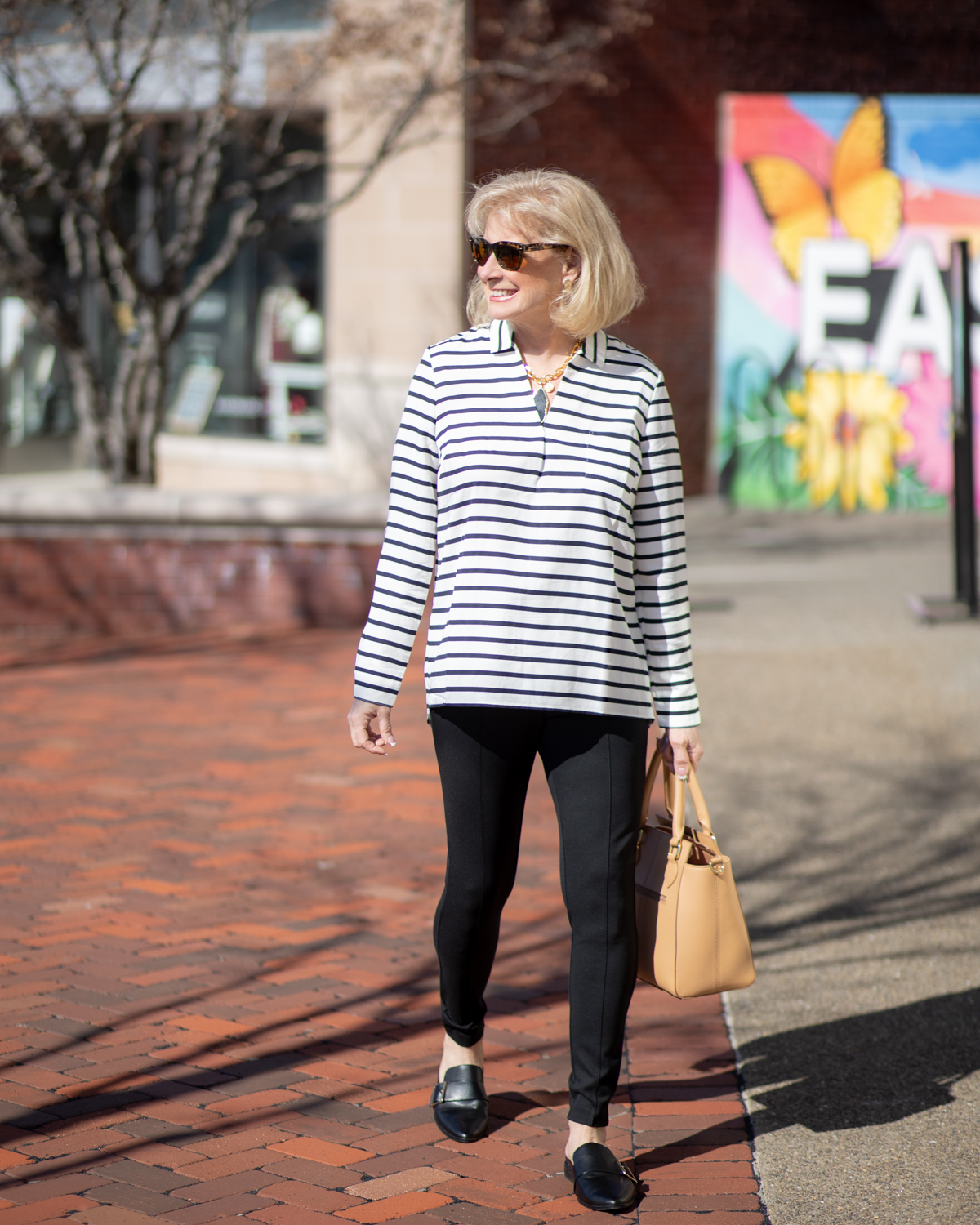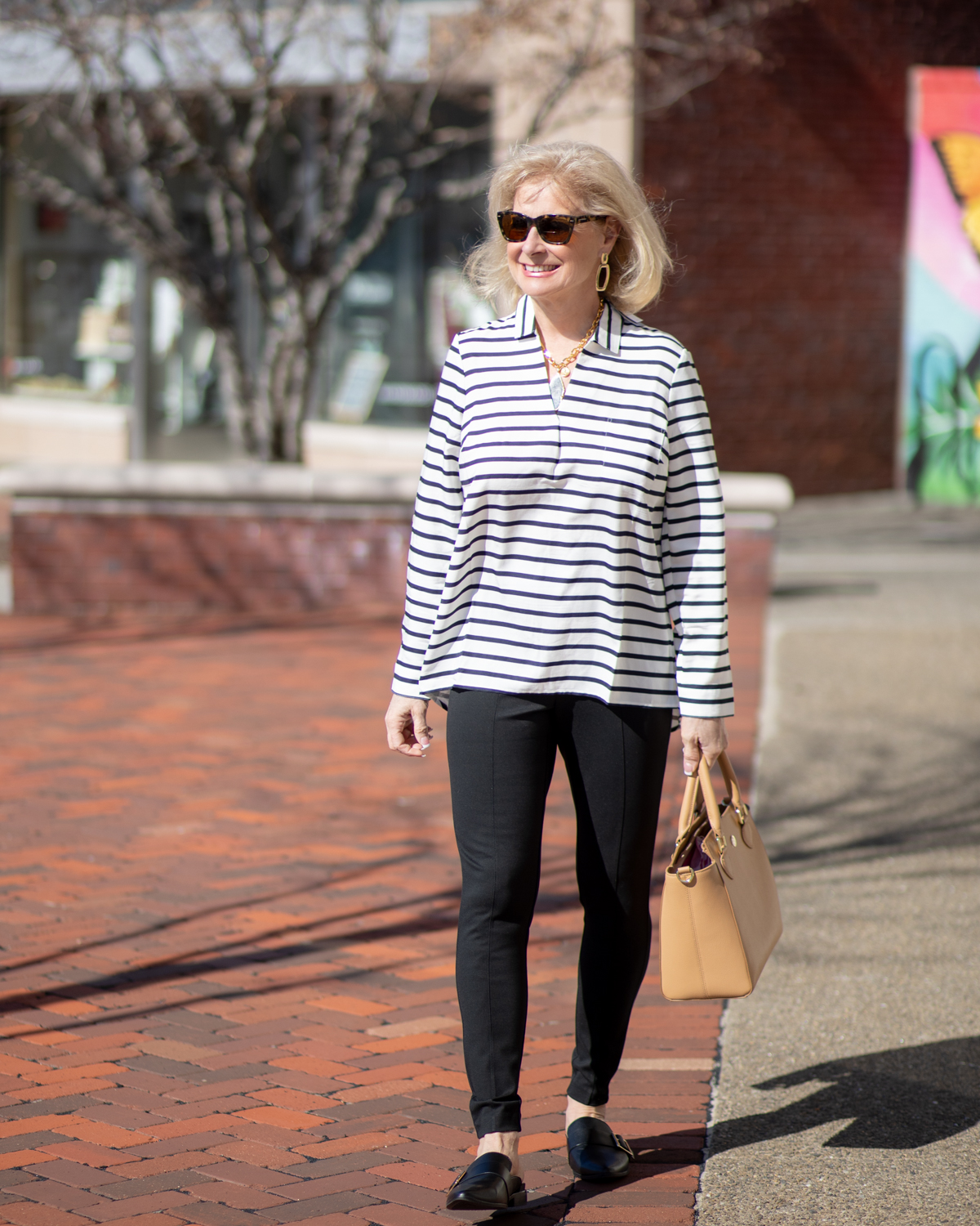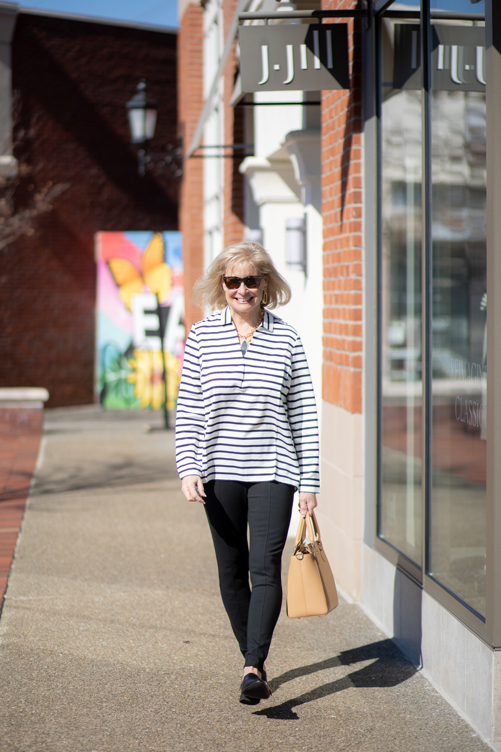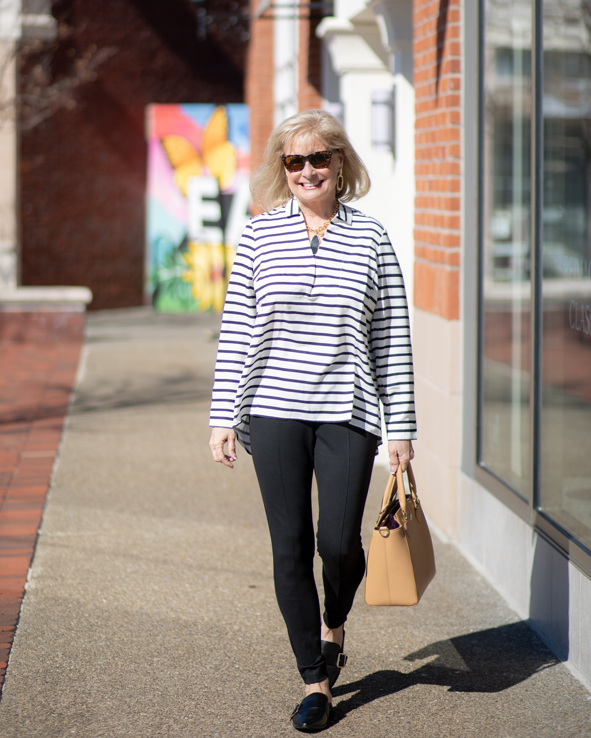 I purchased this striped top to add to my wardrobe because stripes are a classic style that is timeless. It’s a pullover with a curved hemline that is lower in the back. I can wear it with pants and shorts when the weather warms up. I am wearing a medium size.