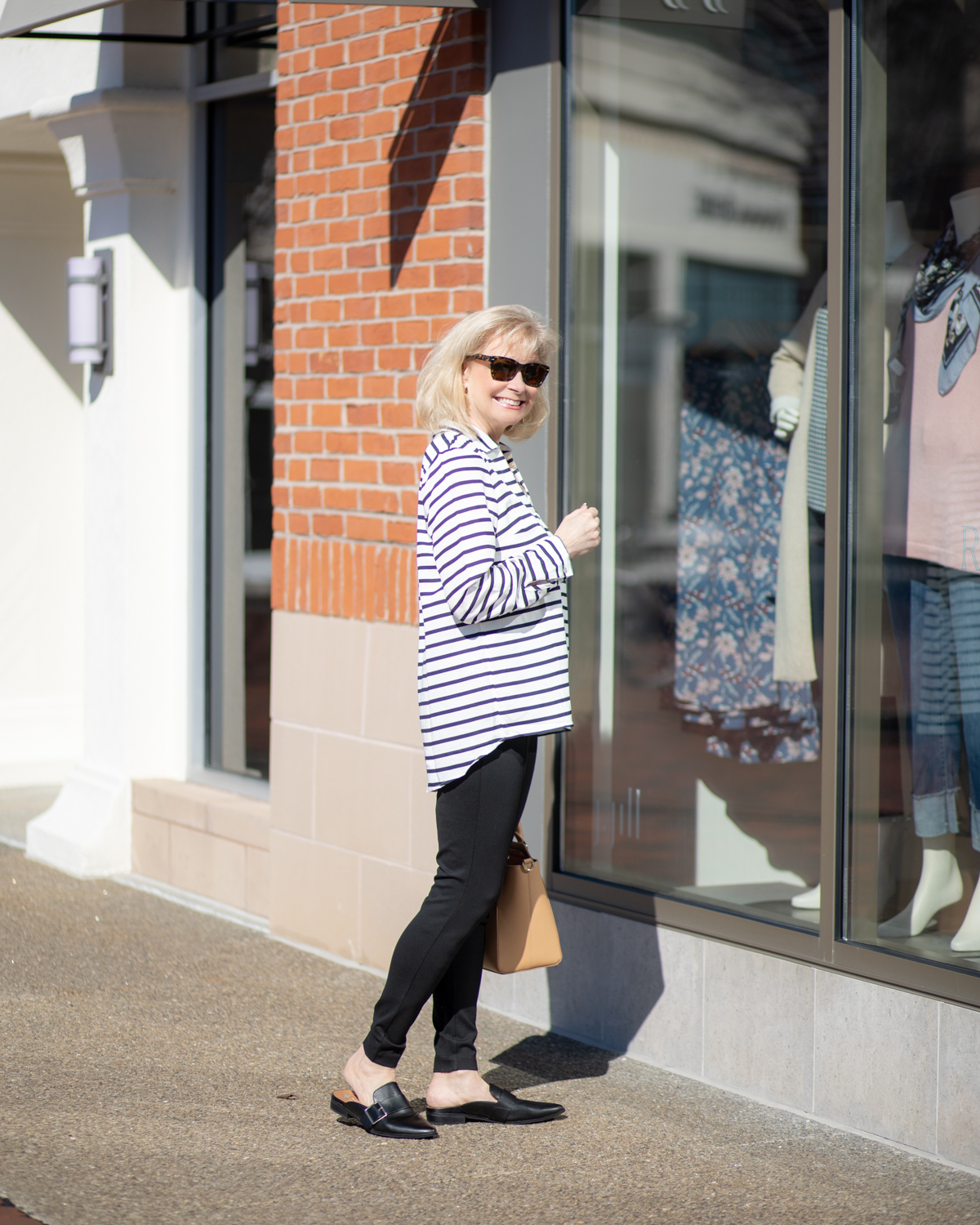 As I have said before I have been doing some retail therapy shopping at J.Jill’s store near me. I am a fan of J.Jill’s Ponte leggings and have a pair of plum-colored ones from the fall collection which I shared with you before. These Smoothing-Ponte leggings are made of a thicker knit and have a front seam down the front. I am wearing a medium and the leggings are long if you have short legs.